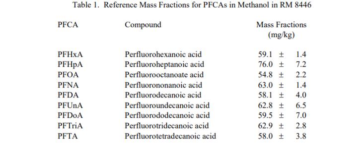 PFCA 和 PFOSA 的參考質(zhì)量分?jǐn)?shù):表 1 中給出了參考質(zhì)量分?jǐn)?shù)值甲醇中的 PFCA 和表 2 中甲醇中的 PFCA 和 PFOSA。這些值基于從溶液的重量法制備獲得的結(jié)果和使用液相色譜法確定的分析結(jié)果。參考值是對真實值的最佳估計的非認(rèn)證值;但是,這些值不符合 NIST 認(rèn)證標(biāo)準(zhǔn),并且提供了可能反映的相關(guān)不確定性僅測量精度,可能不包括所有不確定性來源,或者可能反映多種分析方法之間缺乏足夠的統(tǒng)計一致性 [1]。