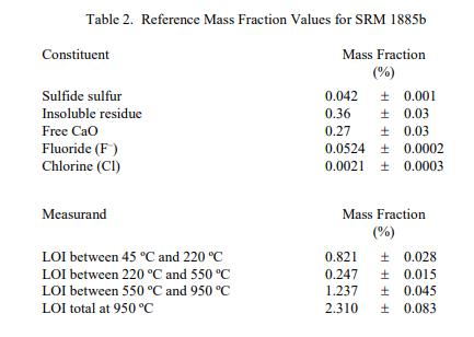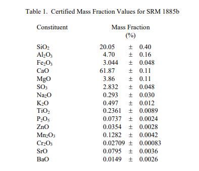 成分和燒失量 (LOI) 的參考值) 報告在表 2 中。NIST 參考值是未經認證的值,它是基于可用數據對真實值的最佳估計;但是,該值不符合 NIST 認證標準,并提供了相關的可能僅反映測量再現性的不確定性,可能不包括所有不確定性來源,或可能反映多種分析方法之間缺乏足夠的統計一致性 [3]。