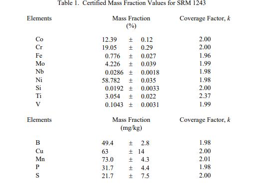 表 1 中報告了 SRM 1243 的 14 種成分的認證值,作為收到時的質量分數值 [1]。 NIST 認證值是 NIST 對其準確性具有最高置信度的值,因為所有已知或可疑的偏差來源都已被調查或考慮在內 [2]。價值分配分析由 NIST 和合作實驗室進行。